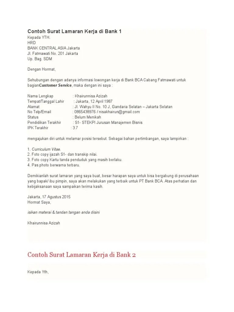 Contoh Surat Lamaran Kerja Di Bank Bca : Contoh Surat Lamaran Kerja Satpam Bank Bri Contoh Surat - Tidak hanya untuk lulusan kuliah perbankan, namun .