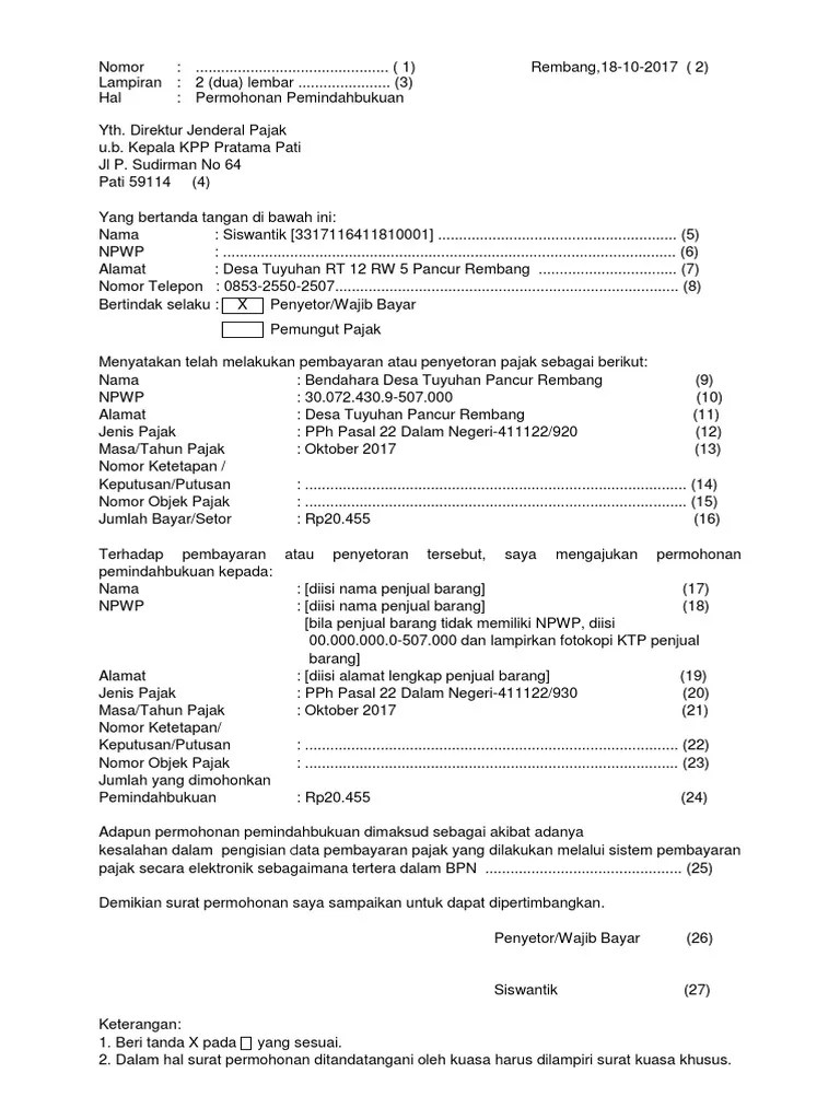 Berikut ini, contoh surat permohonan pemindahbukuan:. Adapun permohonan pemindahbukuan dimaksud sebagai akibat adanya. Text of format permohonan pemindahbukuan dana. Surat pernyataan bahwa ssp tersebut belum dikreditkan. Pajak yang terutang dalam surat pemberitahuan, surat ketetapan pajak, surat tagihan . Berikut contoh surat permohonan pemindahbukuan:. Pemindahbukuan karena jumlah pembayaran pada ssp, bpn, atau bukti pbk lebih besar daripada pajak yang terutang dalam surat pemberitahuan, . Bpn, bisa diajukan untuk pemindahbukuan jika pembayaran pajak tersebut belum terhitung di pajak spt,; Setor pajak padahal ingin diajukan untuk masa pajak lain, anda bisa membetulkannya dengan melakukan permohonan pbk atau pemindahbukuan. Pemindahbukuan karena salah mengisi surat setoran pajak (ssp) baik menyangkut wajib. Berikut contoh surat pbk dalam hal pbk dilakukan .